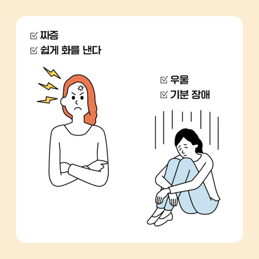 많은 감정변화가 오는 시기이지만 이유없이 울기도 하고 사소한것에도 울고싶기도 하죠. 짜증을 많이 부리기도 하지만 반면 우울한 것도 대표적입니다. 당신 조증이야? 할 정도로 오락가락도 많이 하죠.